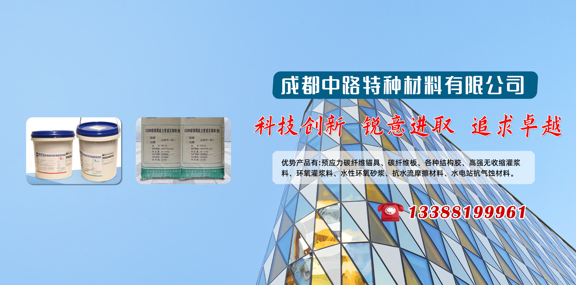 成都中路特種材料有限公司借助清華大學高分子材料學科、晨光化工研究院、西南交通大學、四川交通職業(yè)技術學院科研技術平臺成為一家集新材料研發(fā)、銷售、技術服務和施工于一體的專業(yè)服務公司,優(yōu)勢產品有:預應力碳纖維錨具、碳纖維板、各種結構膠、高強無收縮灌漿料、環(huán)氧灌漿料、水性環(huán)氧砂漿、抗水流摩擦材料、水電站抗氣蝕材料和研發(fā)各種特殊用途膠黏劑產品地處西南腹地成都,業(yè)務覆蓋四川各大中小城市、重慶、云南、昆明、新疆、西藏等區域。產品涵蓋各種加固施工材料、施工設備及施工配件,品牌有威士邦等aa進口品牌,同時批發(fā)銷售國產高、中、低端品牌,為客戶提供全面參考。 成都中路特種材料有限公司為您提供加固行業(yè)的一站式服務! 如果您面對建筑物加固,不知如何下手,我們將針對您的項目情況,提供全面的技術指導咨詢,甚至為您量身定做加固方案;如果您面對項目要求,不知如何購買加固材料,我們將根據您的需要,提供多種參考,從進口品牌、國內知名品牌到低端產品,一應俱全; 如果你萬事俱備,不知何處尋找施工人員,我們可以為您提供具有多年加固經驗的專業(yè)隊伍;中路特種材料致力于為客戶提供全方位的建筑物加固解決方案。 成都中路特種材料有限公司是一座橋,一座連接廠家與用戶的橋,以質量求生存,以信譽圖發(fā)展,成都中路特種材料有限公司期望用真摯的服務筑起一座客戶信任之橋。   科技創(chuàng)新 銳意進取 追求卓越!        熱忱歡迎業(yè)內專業(yè)人士加盟合作!